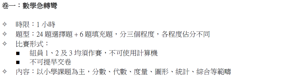 比賽日期:2025年12月13日 地點:東華三院李潤田紀念中學 報到時間:8:30 – 8:45 比賽時間:9:00 – 11:00 |