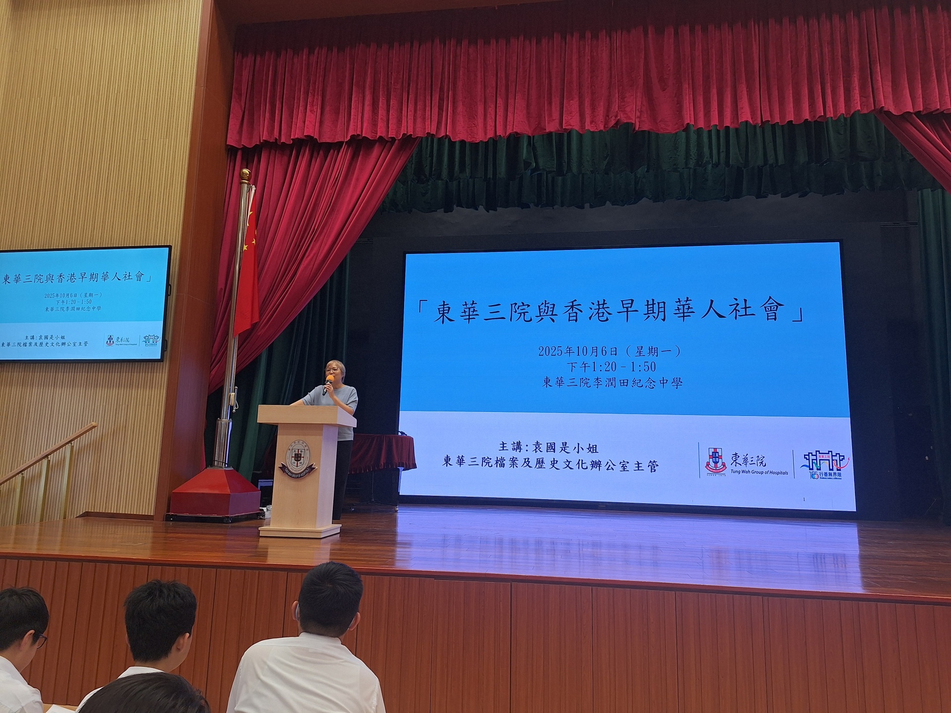 我們非常高興邀請了東華三院檔案及歷史文化辦公室的主管袁女士為我們的中一新生介紹東華三院與早期華人社會的關係。由東華義莊到籌建醫院,到辦學,介紹東華三院紮根香港的故事,以及我們學校歷史的講座,讓學生了解香港、東華三院和李潤田紀念中學。